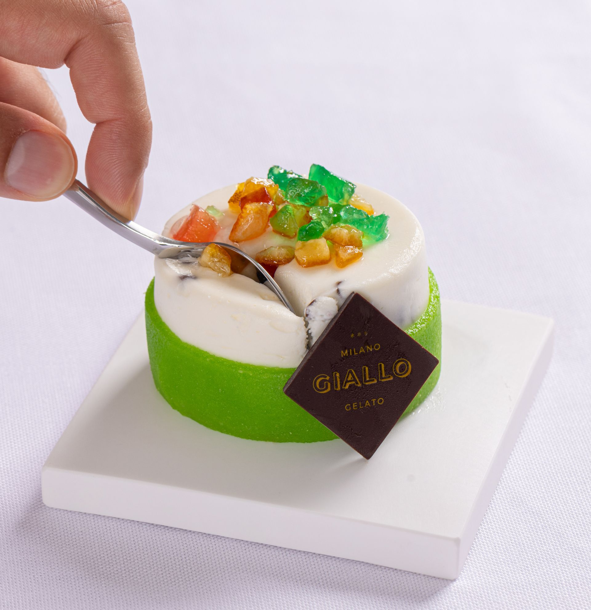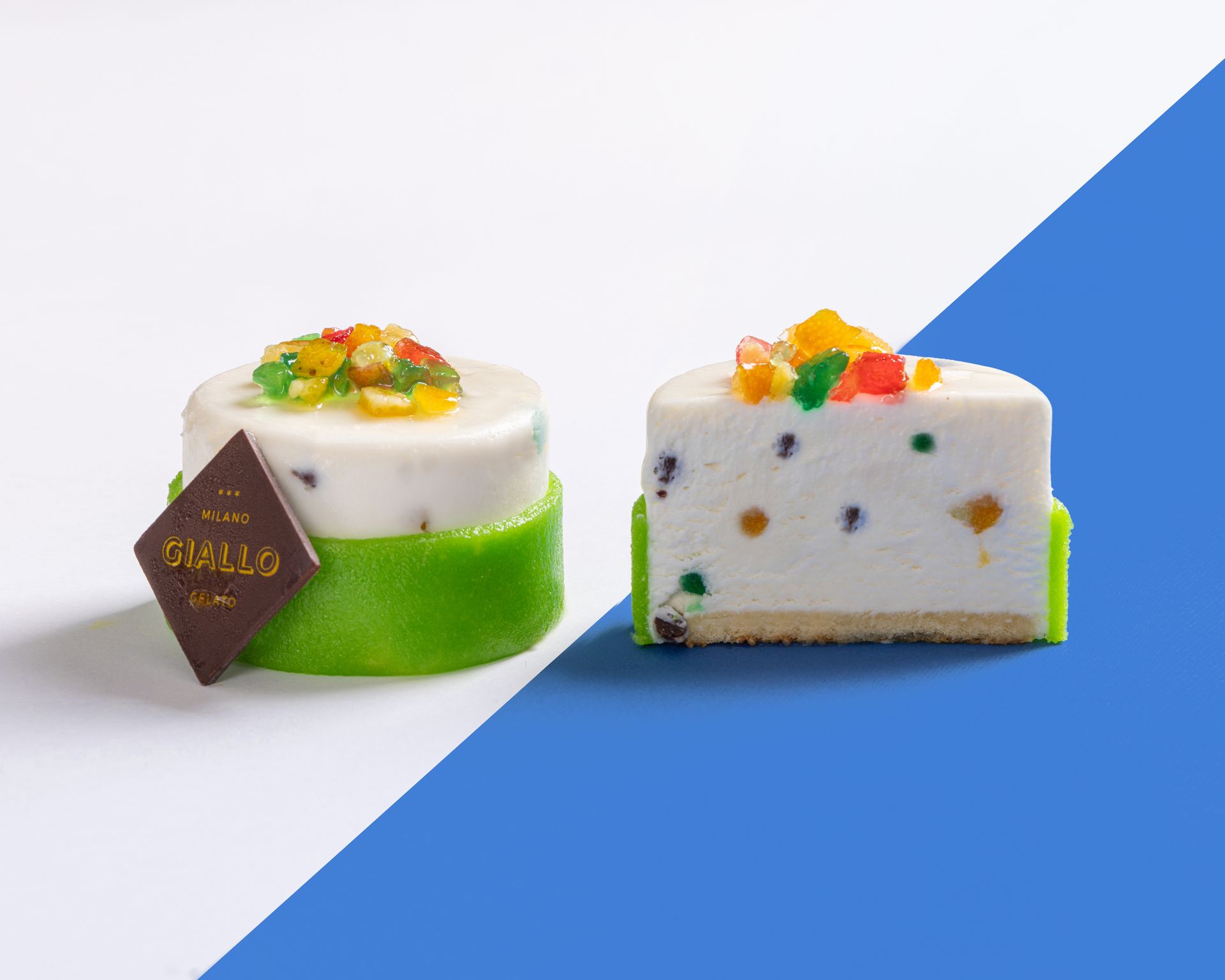 Crema di ricotta di pecora arricchita da canditi e gocce di cioccolato, su una base di pan di Spagna. Il tutto avvolto da una pasta di mandorle stesa a mano, che ne esalta la tradizione e la dolcezza.
