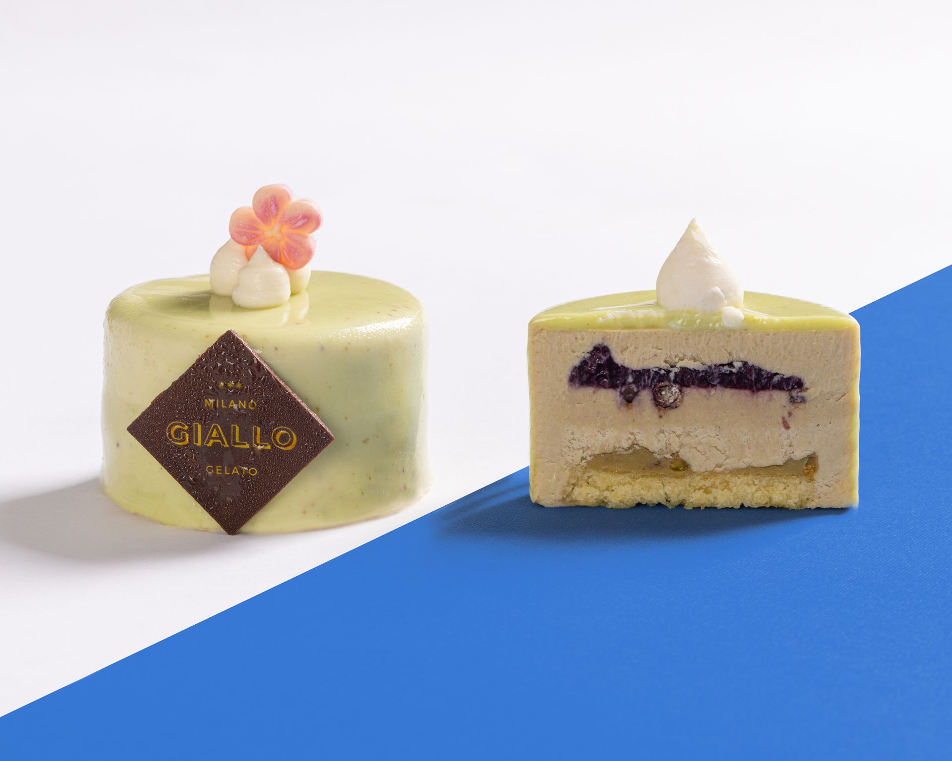 Un alternarsi di bavarese al pistacchio e namelaka al pistacchio, arricchita da una sofisticata composta di lamponi freschi. Il tutto poggia su una base di bisquit al pistacchio croccante.